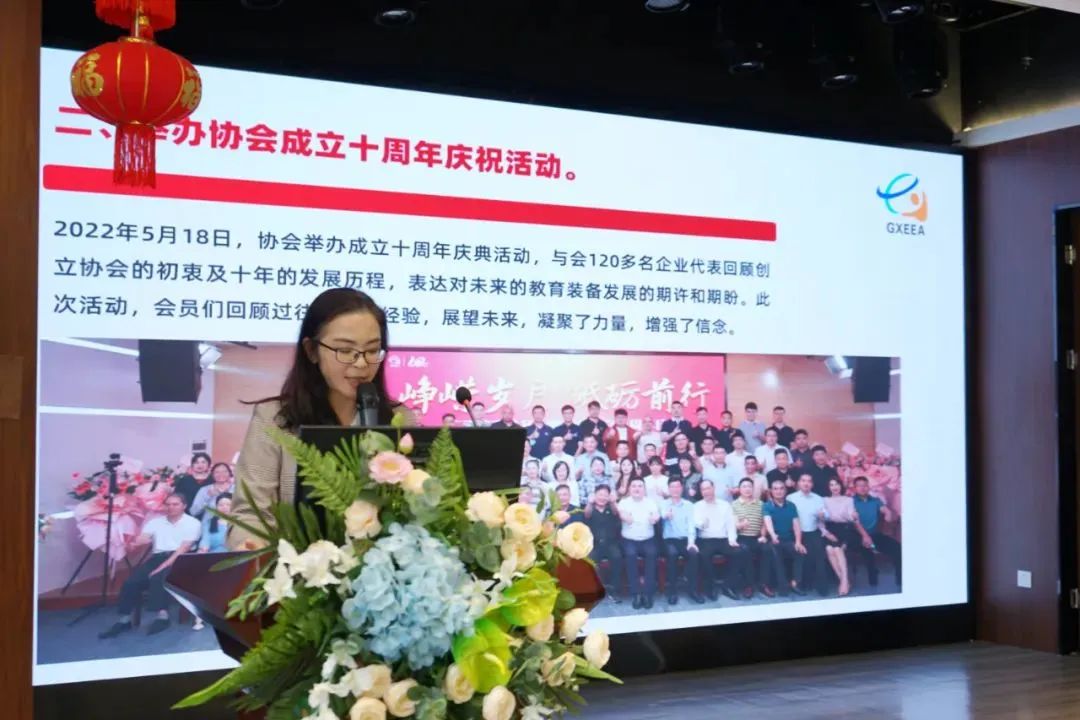 張珊會長對協(xié)會2022年工作情況進(jìn)行了總結(jié)匯報(bào)。2022年協(xié)會密切關(guān)注國家大事,堅(jiān)定不移與黨中央保持高度一致,組織協(xié)會會員企業(yè)集中學(xué)習(xí)黨的二十會議精神。在新冠疫情的大環(huán)境下,舉辦協(xié)會成立十周年慶典活動,成功舉辦第11屆廣西教育裝備展示會,成立協(xié)會專家組,與廣西標(biāo)準(zhǔn)化協(xié)會簽訂發(fā)展戰(zhàn)略合作協(xié)議,同時(shí)積極吸收優(yōu)質(zhì)會員企業(yè),開展各種研討培訓(xùn)、展示交流、參觀考察、公益捐贈等活動,在會員的共同努力下,向行業(yè)向企業(yè)交出了一份滿意的答卷。