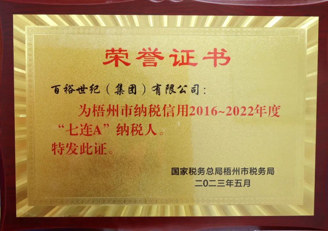 近日,經(jīng)國家稅務(wù)總局梧州市稅務(wù)局評審,百裕世紀(jì)(集團(tuán))有限公司被評為2016~2022年度“七連A”納稅人,這是我們堅(jiān)持依法、誠信經(jīng)營的實(shí)質(zhì)成果。