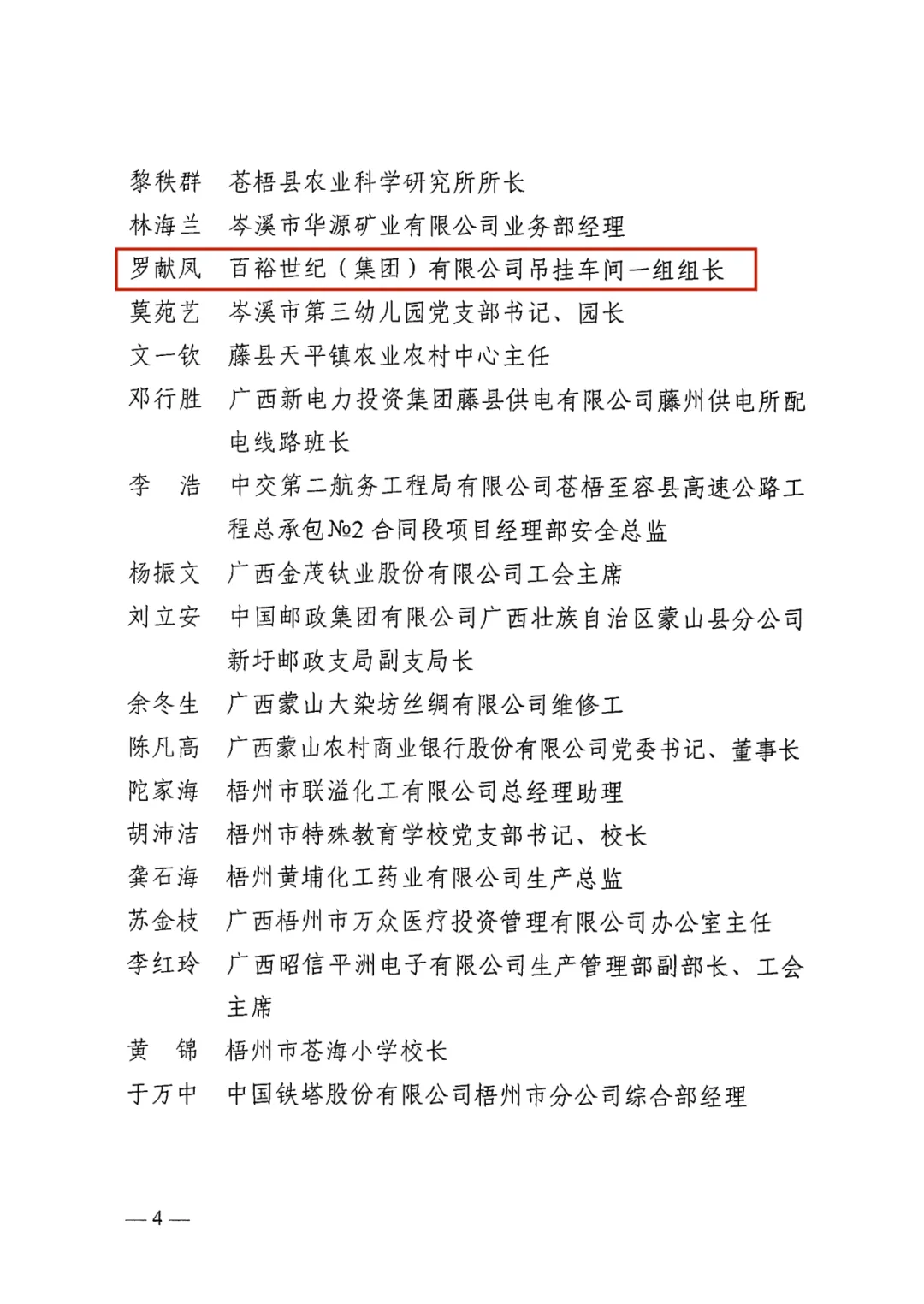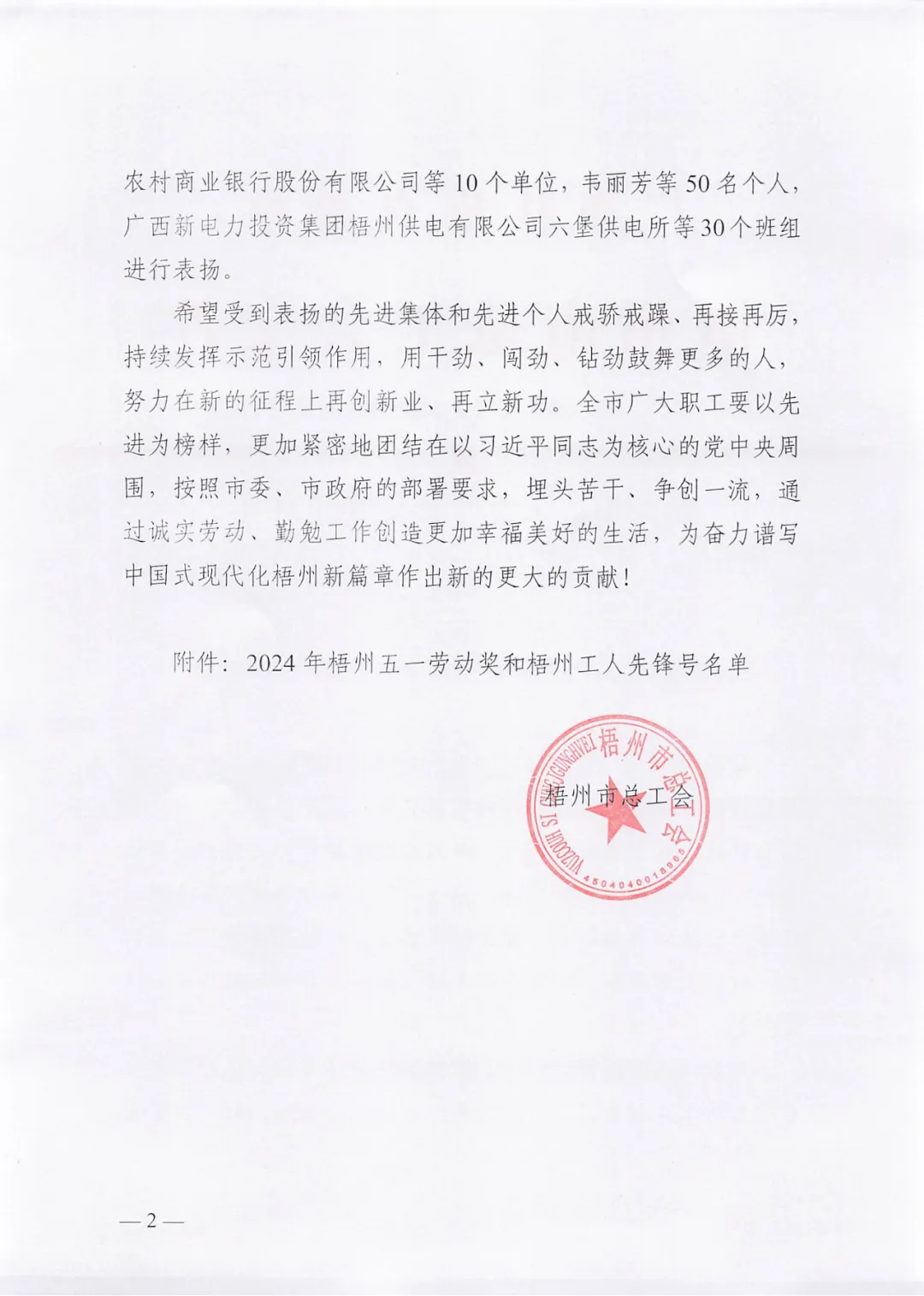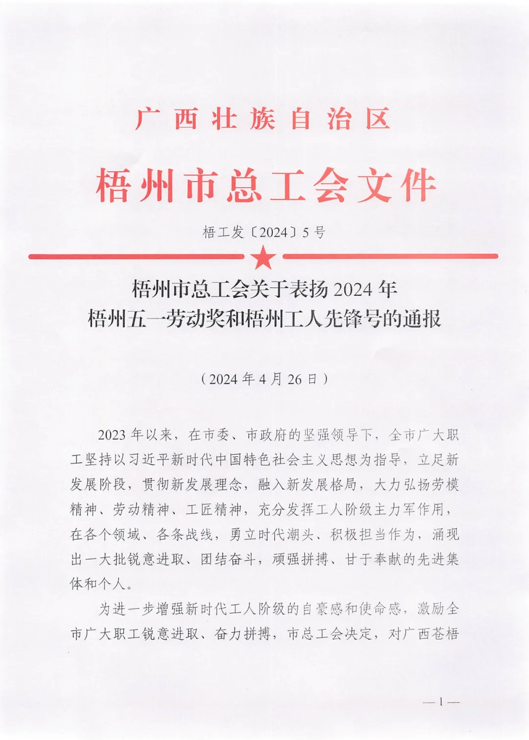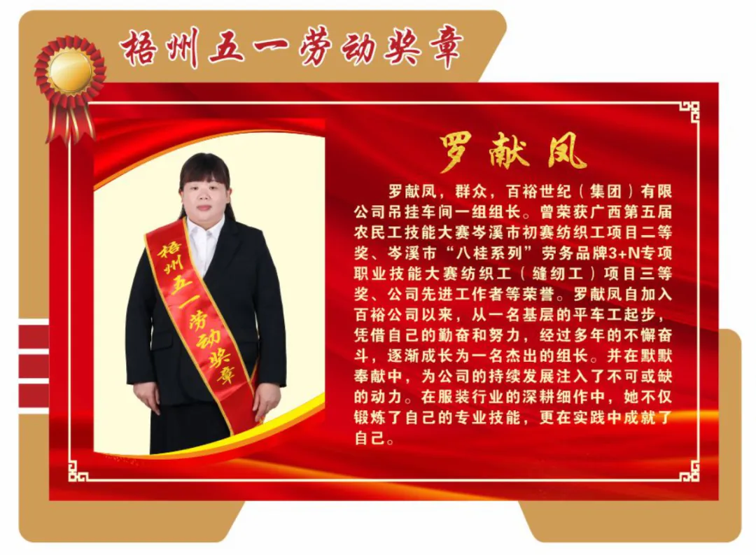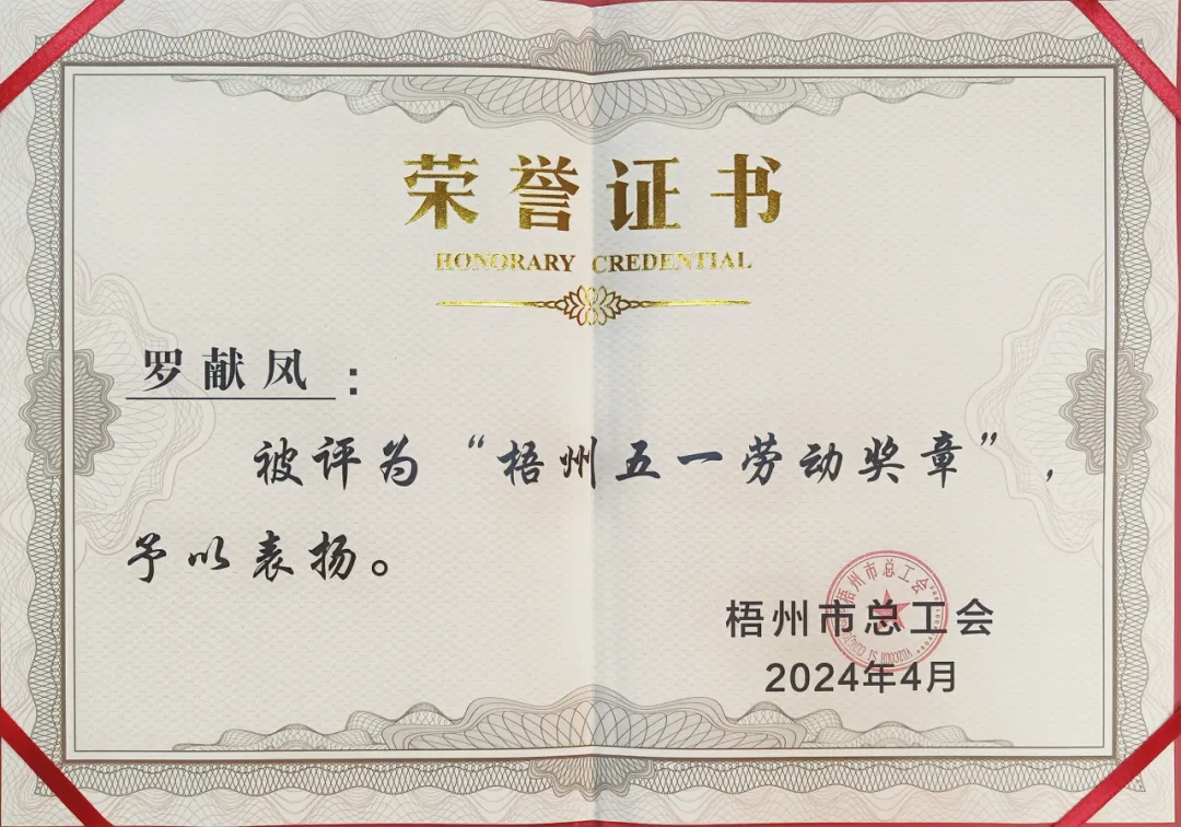 4月26日,梧州市總工會印發(fā)《梧州市總工會關(guān)于表揚2024年梧州五一勞動獎和梧州工人先鋒號的通報》,百裕世紀(jì)(集團)有限公司羅獻鳳同志榮獲2024年“梧州五一勞動獎?wù)隆薄?/span>