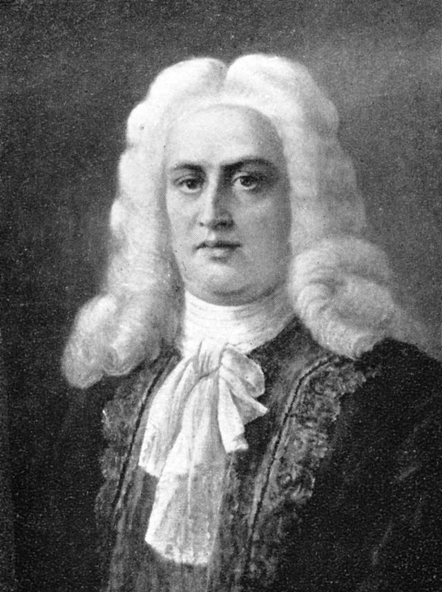 插畫,德國作曲家喬治·弗里德里?!ず嗟聽?/span>(1685-1759)。這個時期領(lǐng)帶的樣式在法朗士小說《領(lǐng)帶》中可見 :" 他的暗綠色上裝的領(lǐng)子豎得很高,他穿著一件南京紫花布背心,黑綢子寬領(lǐng)帶在他的頸子上繞了三圈。"